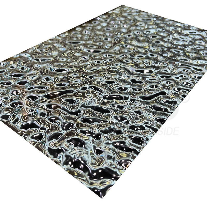 Tấm có hiệu ứng gợn sóng nước trên bề mặt và hoa văn dập nổi titan đen. Tấm thép không gỉ dập nổi titan đen bề mặt gương gợn sóng nước kích thước nhỏ được làm từ thép không gỉ cao cấp, giúp nó có độ bền cao và chống gỉ, ăn mòn và các hình thức hao mòn khác.